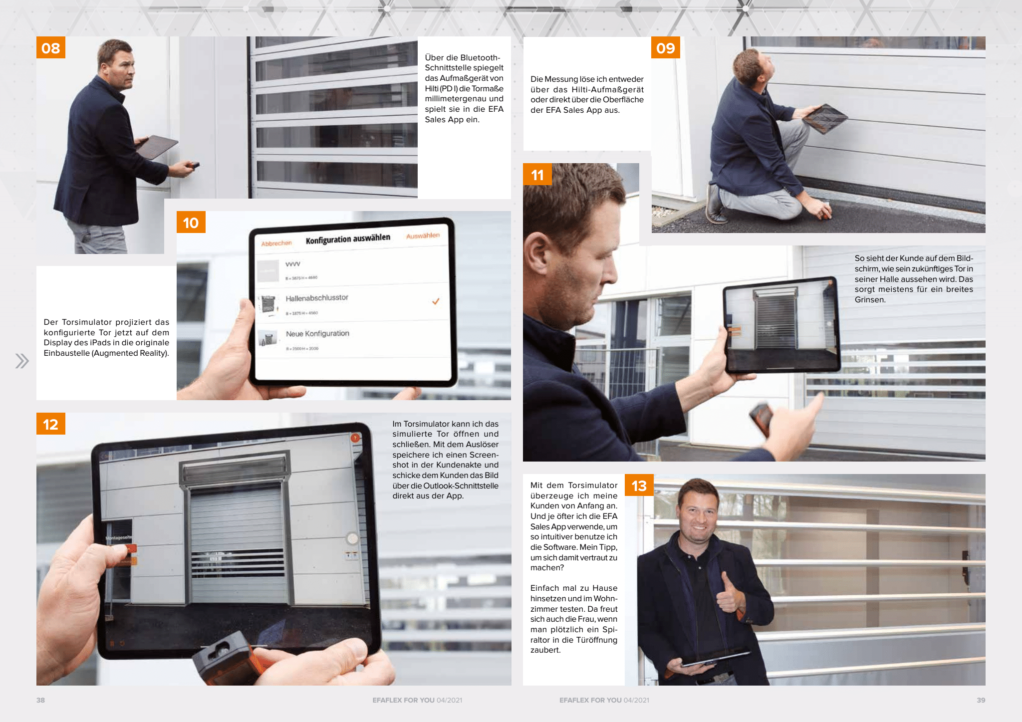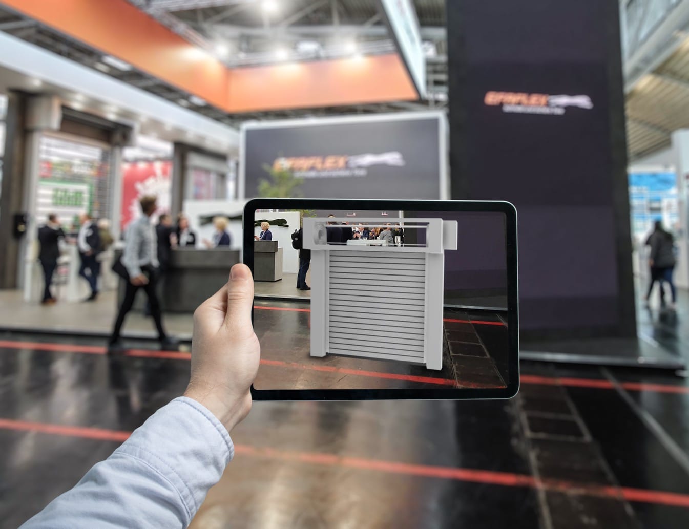 Augmented Reality bringt das konfigurierte Tor direkt in die reale Umgebung: Per Tablet-Kamera wird das Produkt maßstabsgetreu am geplanten Einbauort platziert – inklusive Öffnungs-Animation. So können Kunden ihre Entscheidung visuell erleben, bevor das erste Blech geschnitten wird.